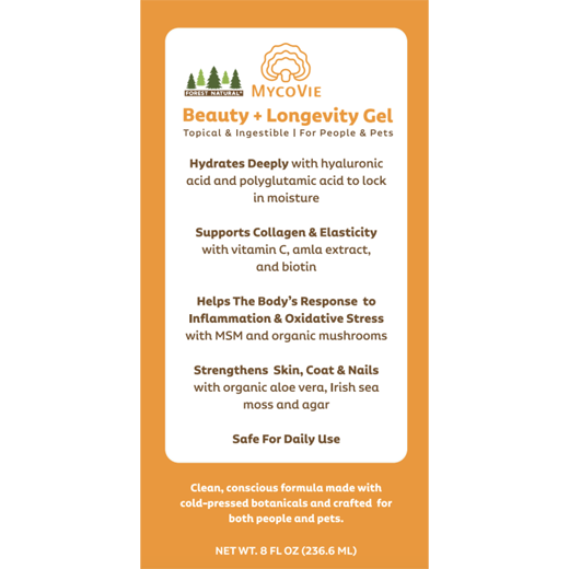 MycoVie Beauty + Longevity Gel is a revolutionary, dual-purpose gel designed to support beauty, skin, and graceful aging for both pets and people. Whether massaged into skin or scalp, or stirred into your morning smoothie or pet food, this plant-powered gel delivers a concentrated dose of nature’s most powerful and helpful ingredients, making it a truly universal approach to address aging and cellular renewal.